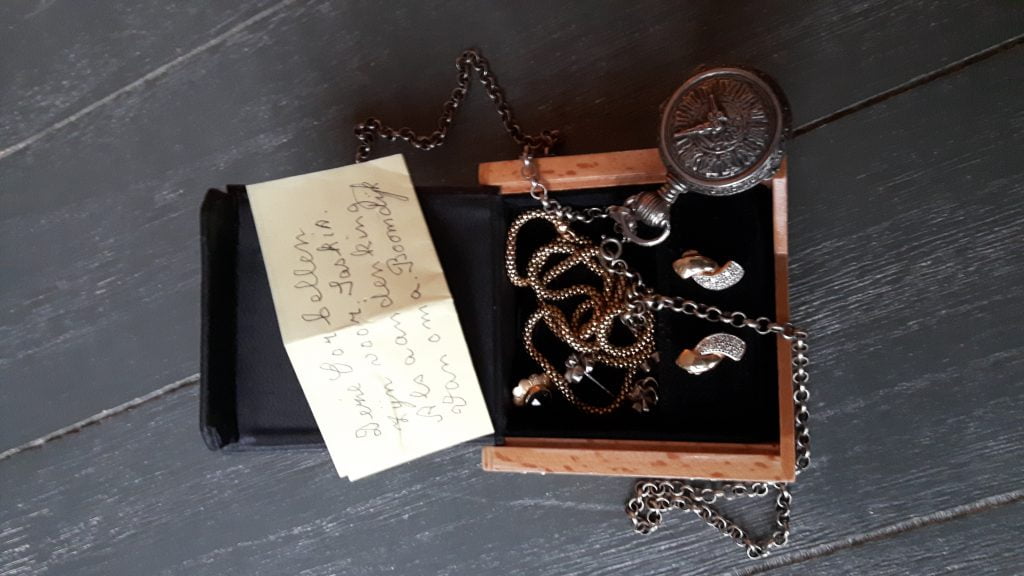 Jouw kistje dat je lang geleden had weggelegd met net zo opzichtige gouden oorbellen en een briefje. Een briefje voor mij.